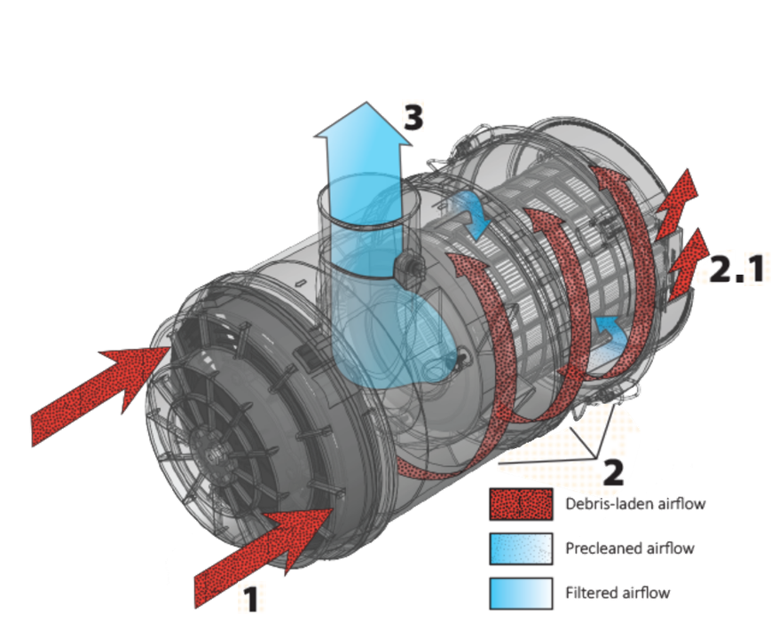 Particulates are thrown to the outer walls (2.1 Larger particles exit through the ejector port in the case of the CF2 unit) as cleaner air is pushed through the filter.